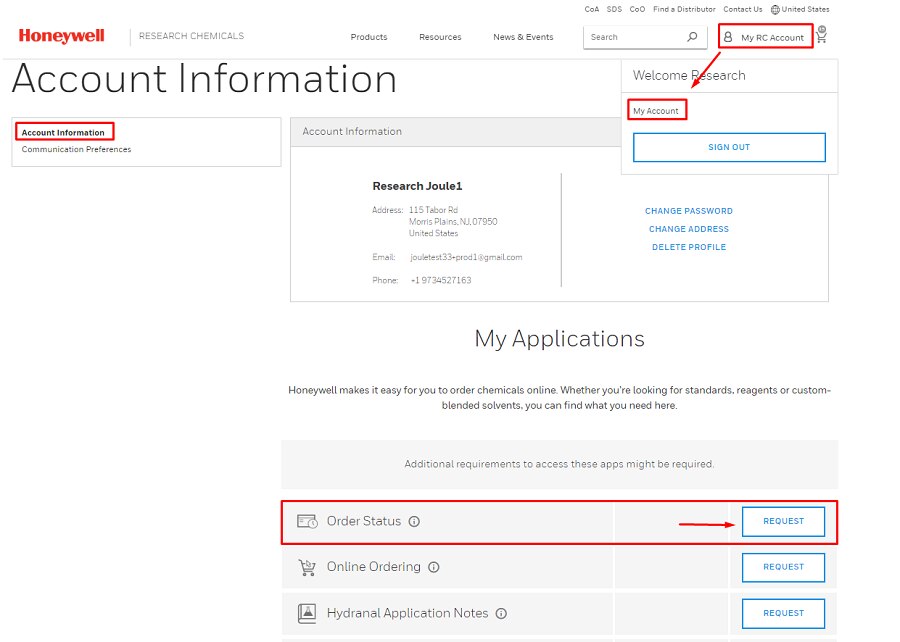 Honeywell Research Chemicals makes it easy for you to manage your orders online, even if they were not placed online, so you will know exactly when and how your order is being delivered.
