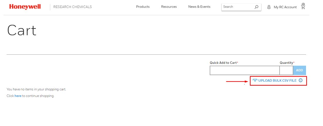 Create a Microsoft Excel file with two or three columns. Place Catalog Numbers in Column A and Quantity in Column B and Quote ID in Column C (distributors) then save as a .CSV (comma delimited) file. Click the cart icon and then choose to Upload Bulk CSV File.