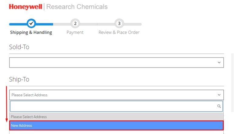 Following the creation of your shopping cart, proceed to checkout. Here you can choose from a list of your existing ship-to addresses or choose to create a new one. Create a new ship-to address will be the first option in the drop down menu – just complete the form and click submit. You can confirm your address on the Review page prior to submitting the order.