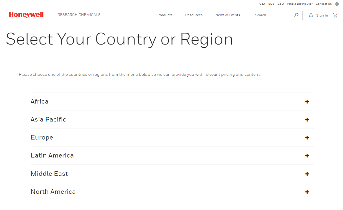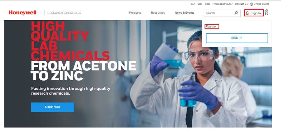 You can register for access to the new Honeywell Research Chemical site by going to lab.honeywell.com and clicking “Sign in” on the top right of the navigation bar. Then click on “Register” in the drop down to create a new account with us.