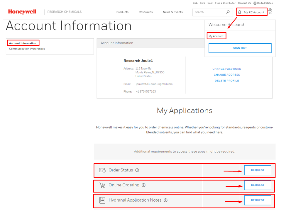 Request access to applications such as order status, application notes, online ordering and distributor resources* under the Account Information tab on your account dashboard (“My RC Account”).