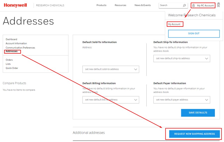 Add and select preferred addresses for faster checkout by using the Addresses tab on your account dashboard (“My RC Account”). You can also add a new address during checkout process. Please note, pricing and catalog availability are associated with the sold-to address for your account.